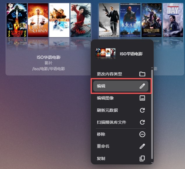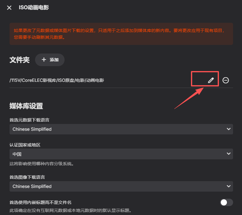 去emby媒体库(如果已建立好ISO的媒体库,请确保文件夹路径是非strm路径,也就是ISO影片的真实路径),然后编辑emby媒体库