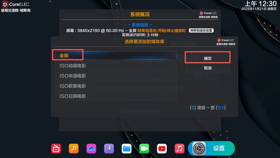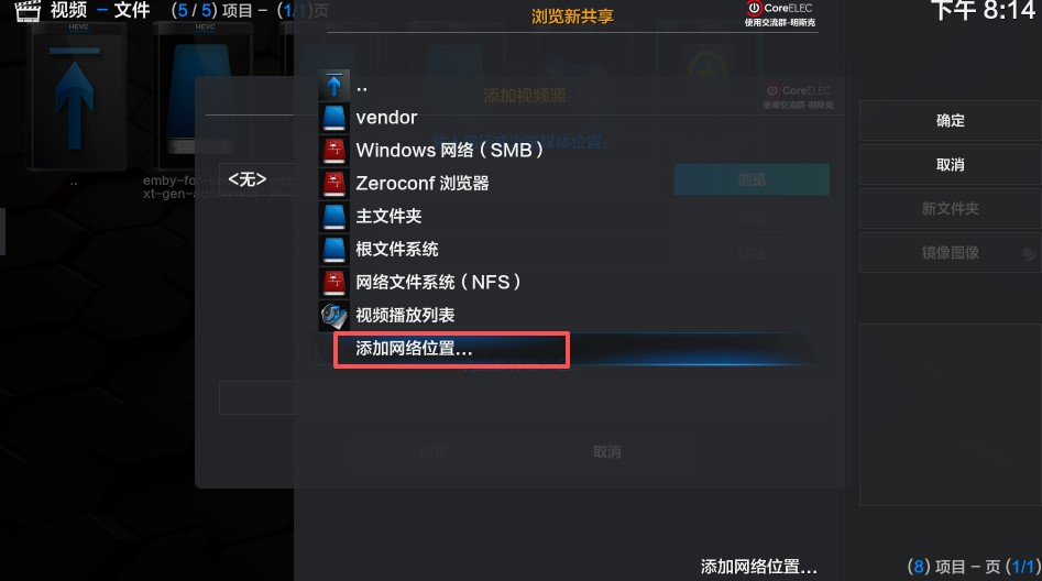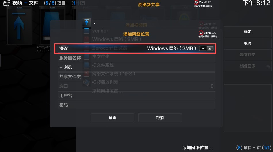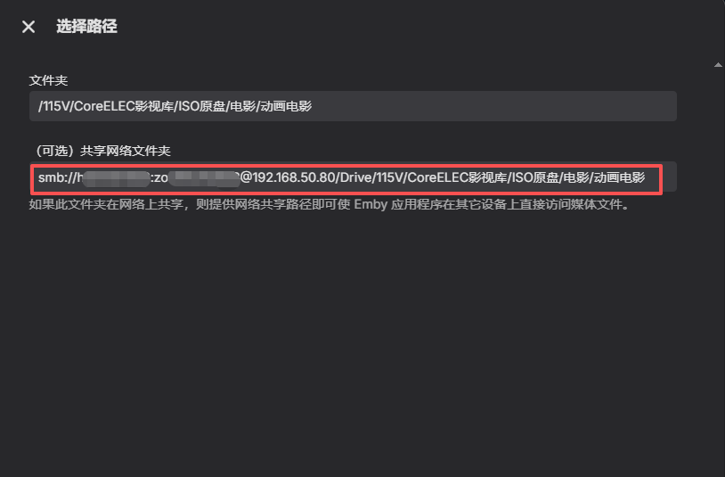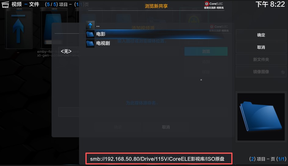 输入共享网络文件夹,比如我这里是smb://192.168.50.80/Drive/115V/CoreELEC影视库/ISO原盘/电影/华语电影
