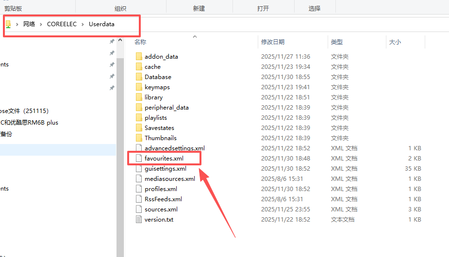 可以通过以下方法绕开下一级目录,直接进入影视库,进入userdata目录下,用记事本打开favouriates.xml文件