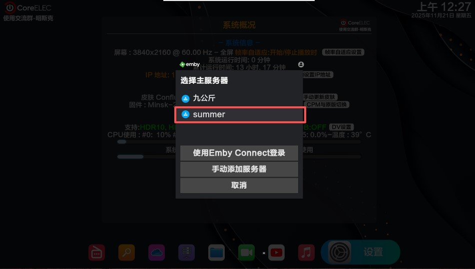 一般会自动弹出本地emby服务器,如果你没有设置过默认302服务器,就直接选择你的服务器名(比如summer)