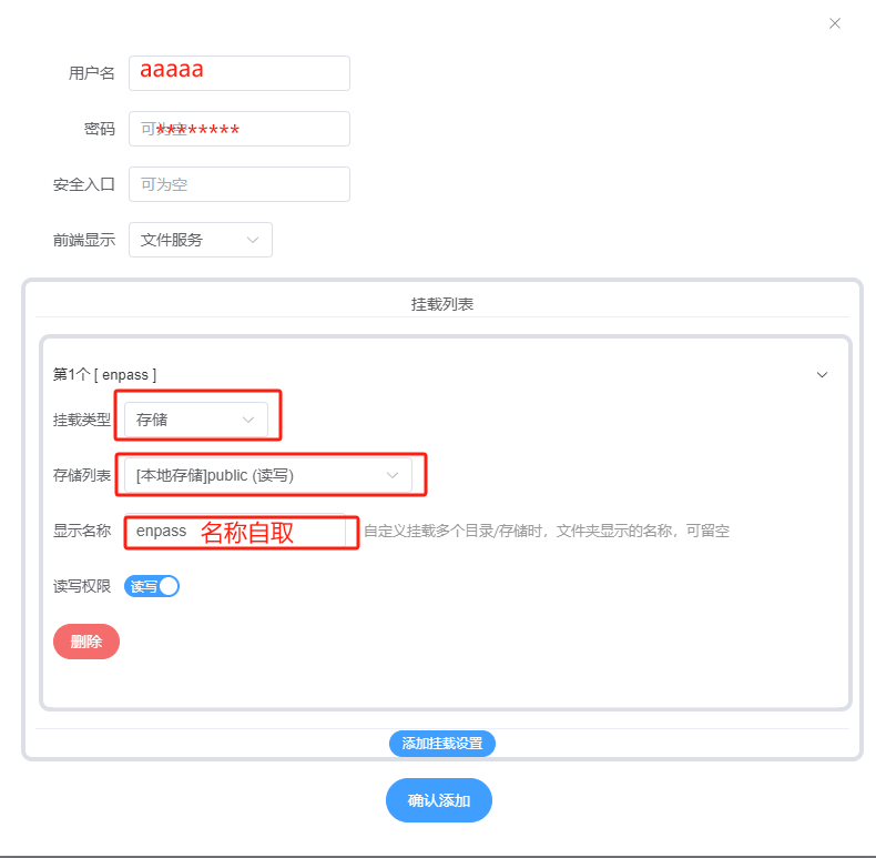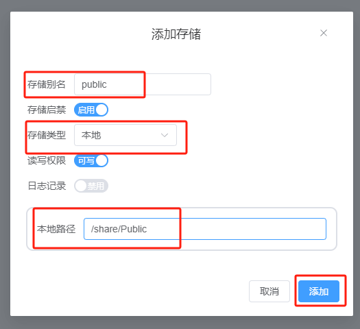 ip:16601,打开lucky,默认666和666账密登陆,左侧网络存储-存储管理-添加存储,如图设置: