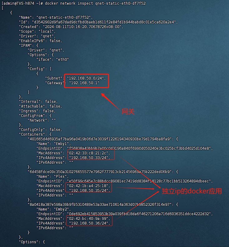 2.复制其中一个网卡名称(红框里吗的),执行命令如:docker network inspect qnet-static-eth0-df7f52