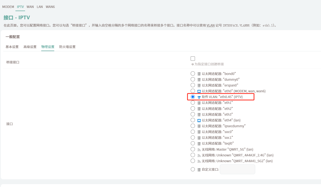 2、进op添加一个网口,自定义eth0.45(看你的wan口是eth0还是多少,保持一致即可,然后45是你的iptv的vlan id,看上图可知),高级设置里面网关跃点随意设置个500或者1000