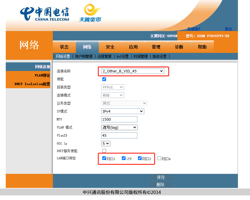 1、用超级密码进入光猫后台,网络-网络设置,下拉选择other_B_VID那个(就是iptv的连接名称),这里默认的只有itv是勾选的,可以把lan口1、2、3、4全勾选了绑定,或者1、2就行,因为网口1一般是用来拨号的,2是固定的itv口,这样保存后网口1就有了iptv流,用来做单线复用,itv口不变可以连你的电视盒子。