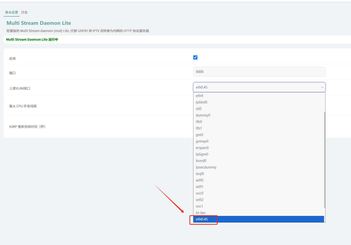 3、启用MSD设置,注意上游vlan口要选择刚刚设置好的eht0.45