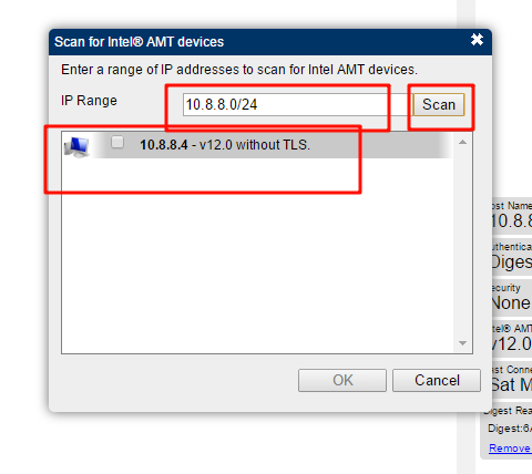 7.pc端安装控制软件MeshCommander,也可以vpro的 ip:16992,选择Scan,输入你的路由ip段(如192.168.50.0)开始扫描,扫描出来后选中,然后点OK